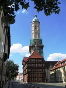 Hier ist die wieder aufgebaute "Alte Waage" und im Hintergrund die Andreaskirche zu sehen.