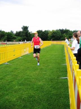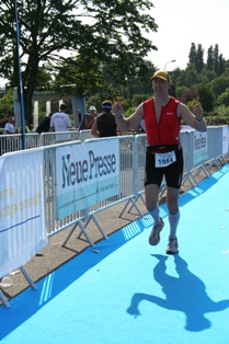 Zieleinlauf nach 600 m Schwimmen, 29 km Radfahren und 8 km Laufen. Und das Wetter: Sehr warm und sonnig!